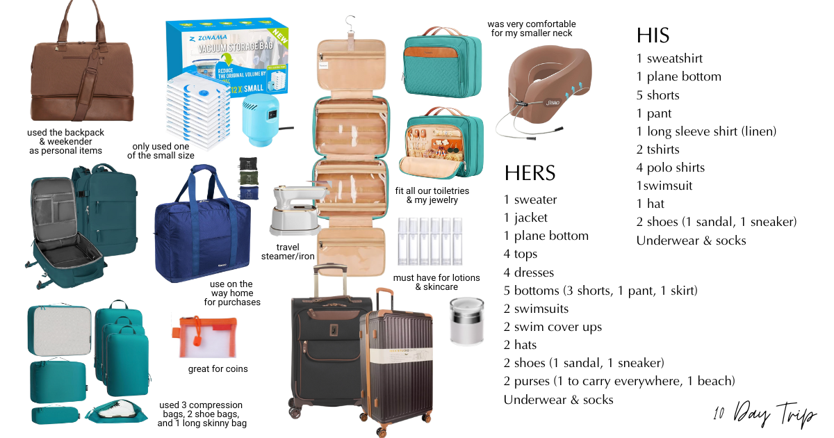 Once both my husband’s and my outfits were finalized, it was time to pack. Compression bags are my favorite—they truly save so much space. This was the first time I used a vacuum-sealed bag, and it worked great for my underwear and socks. That said, I probably could have used an additional compression bag for those instead.